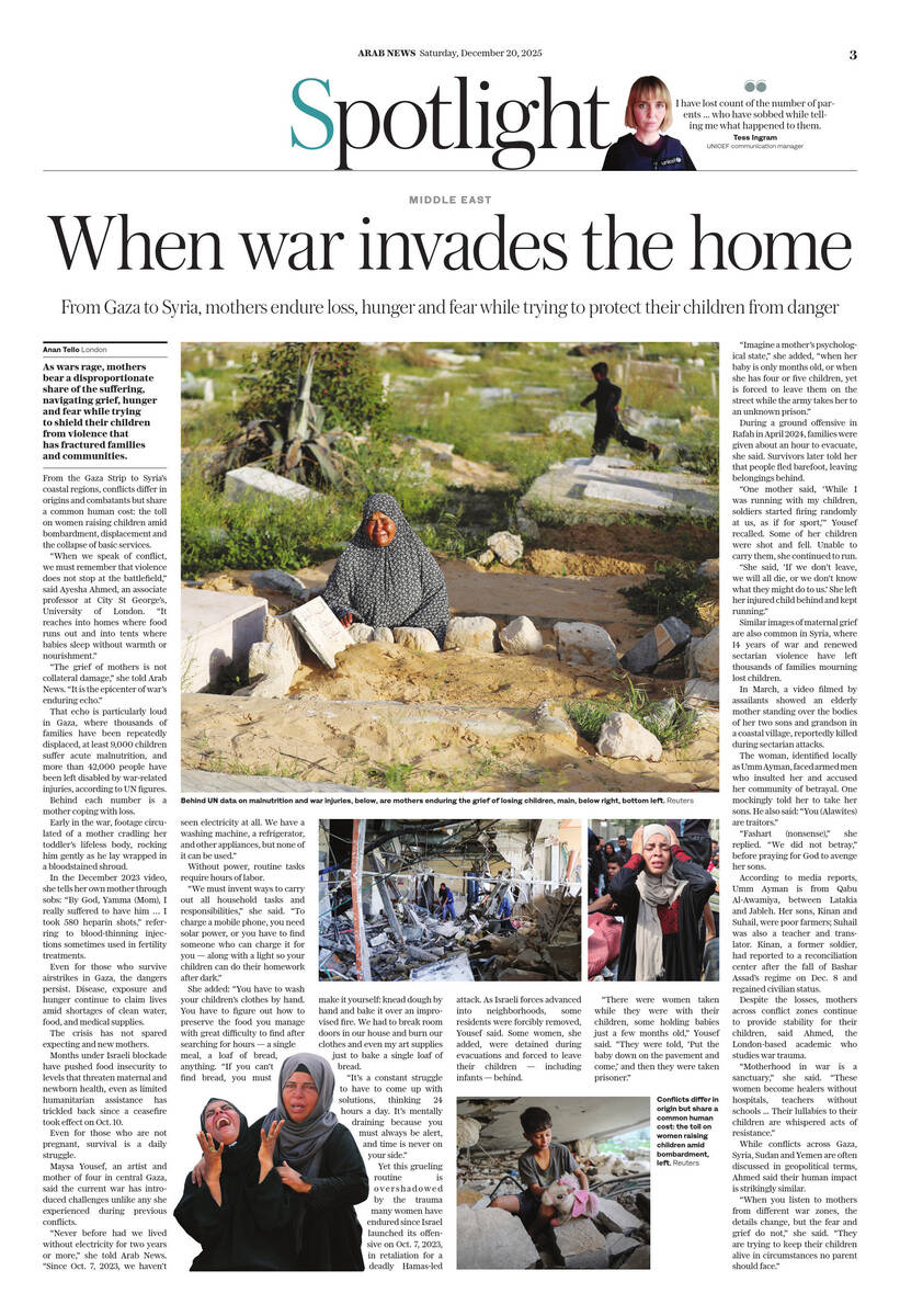 “The grief of mothers is not collateral damage,” she told Arab News. “It is the epicenter of war’s enduring echo.”