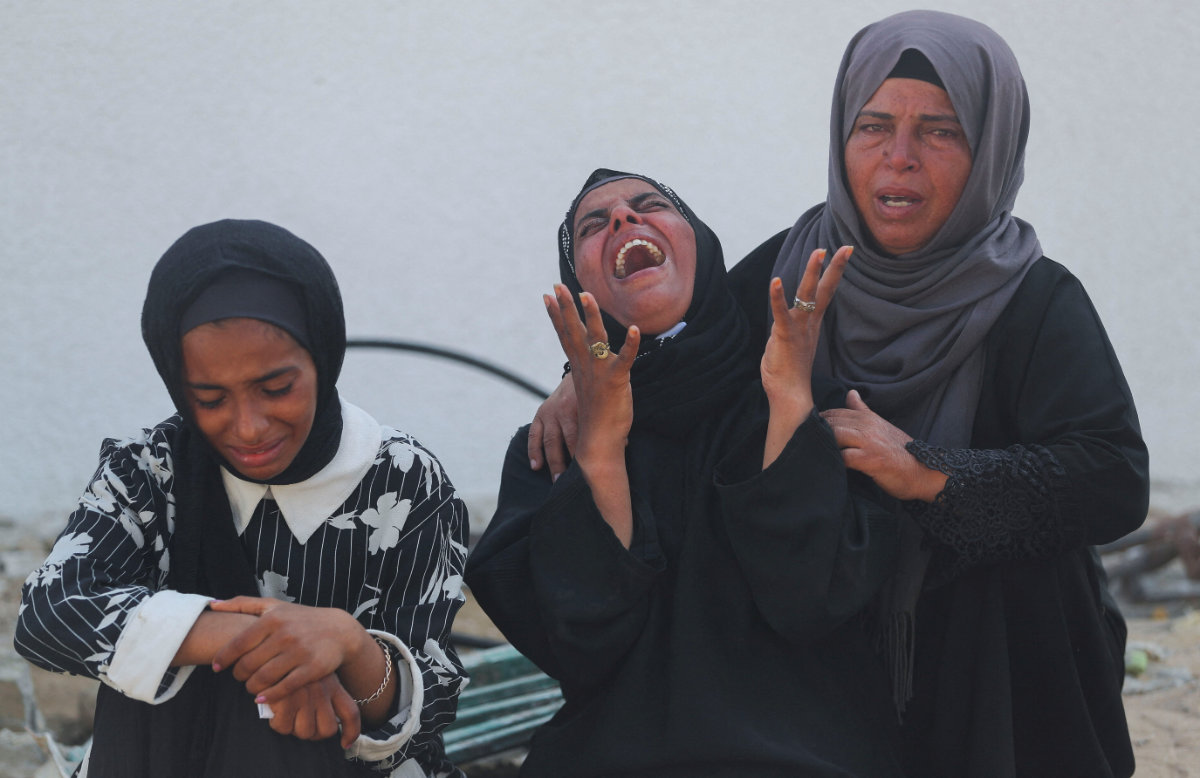 A woman reacts as mourners attend the funeral of Palestinians who were killed, according to medics, in Israeli fire, at Al-Shifa hospital, in Gaza City, June 12, 2025. (REUTERS/Mahmoud Issa)