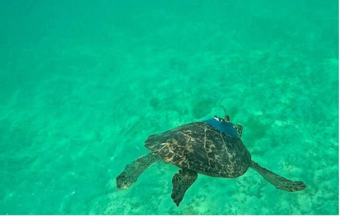 The satellite tags transmit real-time movement data, identifying foraging areas, migratory corridors, and the nesting site of the egg-carrying green turtle, enabling targeted protection and management.