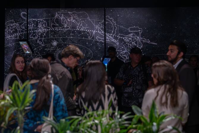 Oscar Santillan’s “Anthem,” meanwhile, centralizes tree tumors as a main motif that responds to sounds produced by visitors to create animal-like noises, complemented by AI and synthetic biology, while Shadia Alem’s “Transformation Jinniyat Lar” is a series of acrylic paintings of female Jinns drawing from local and regional folklore that depicts them as custodians and protectors of the river Lar.