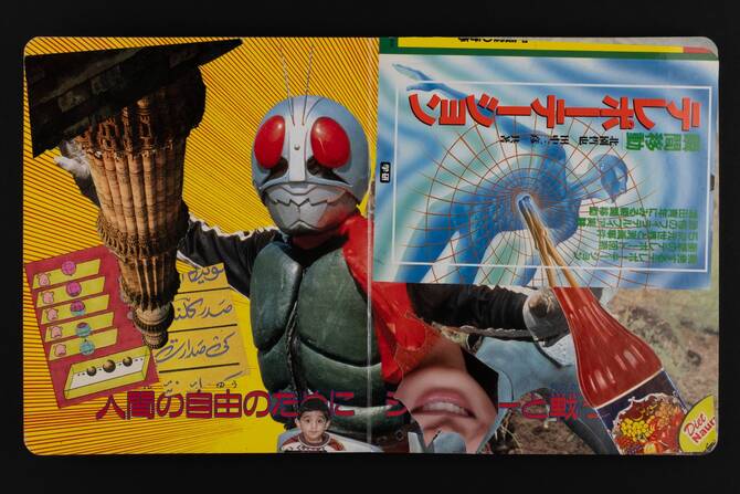 This is one of my collage books. When you make a collage, you decide to keep the original medium; to not interfere with it. And next to it — if you decide, for instance, to draw or write — you put your own touch on something that is already existing. The importance of collage is making the original material communicate with other material that would otherwise never have met. So this, originally, is a “Kamen Rider” book. “Kamen Rider” is a famous TV show in Japan about a masked knight bringing evil characters to justice. When I found this children’s book, right away I thought, “These are beautiful images.” But they’re so foreign to me. So, what images could relate to my experience? I made this book after meeting someone born in Tokyo, growing up in Japan, with Pakistani parents. He told me about his life there. And I imagine in this book the interference of two worlds — the inner world and the outer world. So, the inner world: What you have inside the house, your culture, your food, your habits, the products that you use. Your imagery, you know? And the outer world: You take the metro to go from your neighborhood to your workplace. You get your residency card. You get images on TV that sometimes do not reflect who you are — children of a foreign background growing up in Japan, but growing up with myths and legends from your (parents’ culture) and juxtaposing it with what you see on TV. It’s just a mix-and-match. But if I’d drawn all of this, it would have had a different meaning than using found materials.