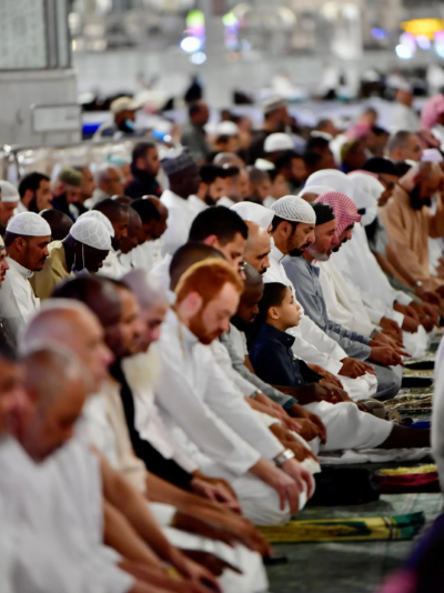 Recitations of the Qur’an echoed throughout the mosque as worshippers stood in long rows, reflecting the unity of Muslims.