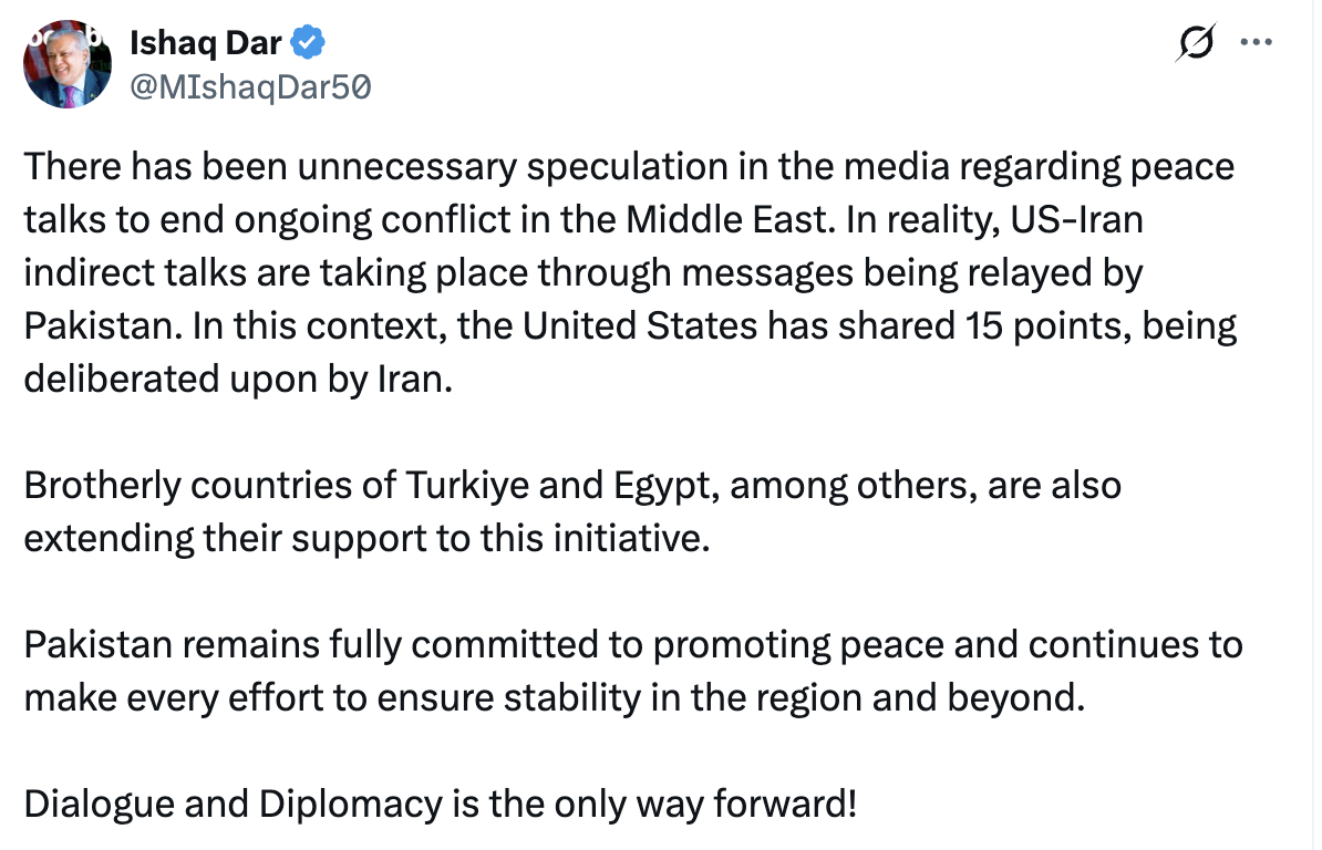 Islamabad has been positioning itself as a potential intermediary, with international media reports suggesting that it has been conveying messages between Washington and Tehran since the start of the crisis. Trump envoy Steve Witkoff confirmed in a cabinet meeting on Thursday that Washington had presented a 15-point action list to Iran “that forms the framework for a peace deal” through the Pakistani government.