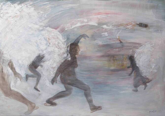 “Resistance and resilience are central subjects in the artistic production of the fifth edition” of the Ramallah Art Fair, according to the show catalogue. This piece by Mira Shihadeh certainly fits the bill. The Cairo-based artist and qualified yoga instructor (the latter “informs the figurative art that is my primary interest,” she notes on her website) first gained recognition when her street art focusing on sexual harassment gained traction in the wake of the #MeToo movement. In an interview with the website Artist Close-Up, Shihadeh said that she wanted her art “to comment on humanity, conflict and resolution, truth and lies, love, community, joy and emotion. I strive to create compositions that will deliver those messages.” She added that she is currently “trying to make art that inspires joy, fun and humor. It’s not easy, and my main challenge is to bring enthusiasm into what I do. I think many artists are striving in that direction.”