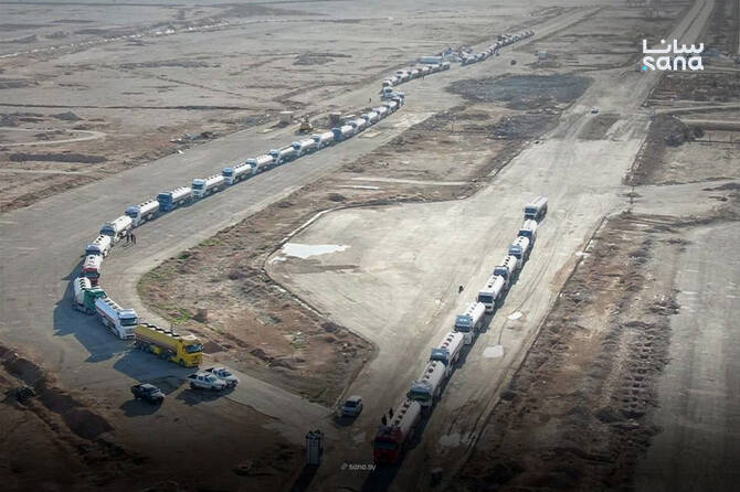 The Syrian Petroleum Company announced that 299 oil-carrying trucks loaded with Iraqi fuel began entering Syrian territory late on Wednesday through the Al-Tanf border crossing, bound for its energy hub on the Mediterranean coast where the oil will be transferred to tankers.