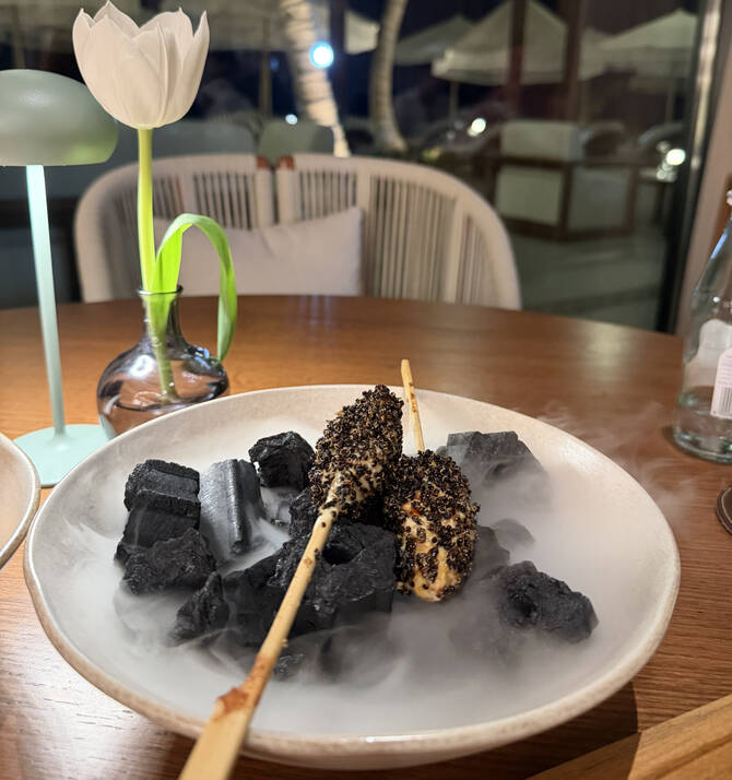 Truffled najel yuzu combined king crab with truffle ponzu and other components, while the chicken tsukune skewers arrived on dry ice, coated with a ginger-based sauce and crispy quinoa.