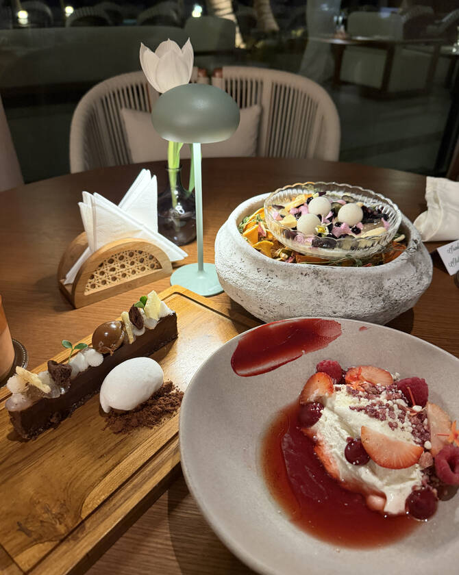 Desserts and drinks stood out for their creativity. I tried the Bounty bar tart, which combined chocolate and coconut in layers with lemongrass gel and caramelized white chocolate; the yuzu posset, pairing blueberry, vanilla, and thyme for a tangy-sweet balance; and the “textures of red berries,” featuring yogurt mousse, white chocolate, and vanilla for a creamy and fruity mix.