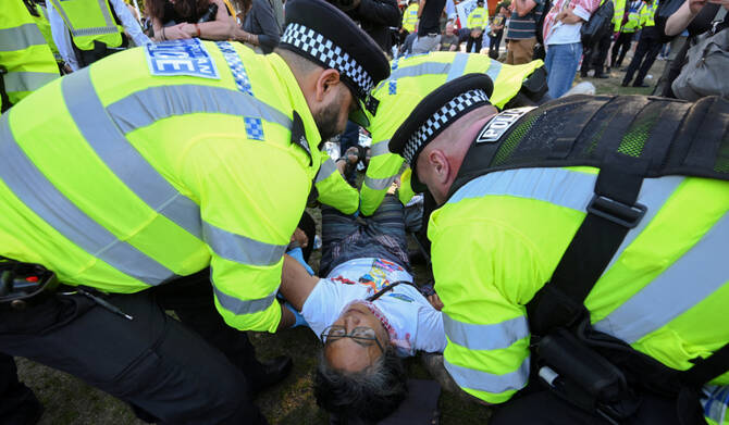LONDON: British police said they arrested seven people on Sunday at a protest near an air base in eastern England used by US forces, accusing them of supporting the banned group Palestine Action.