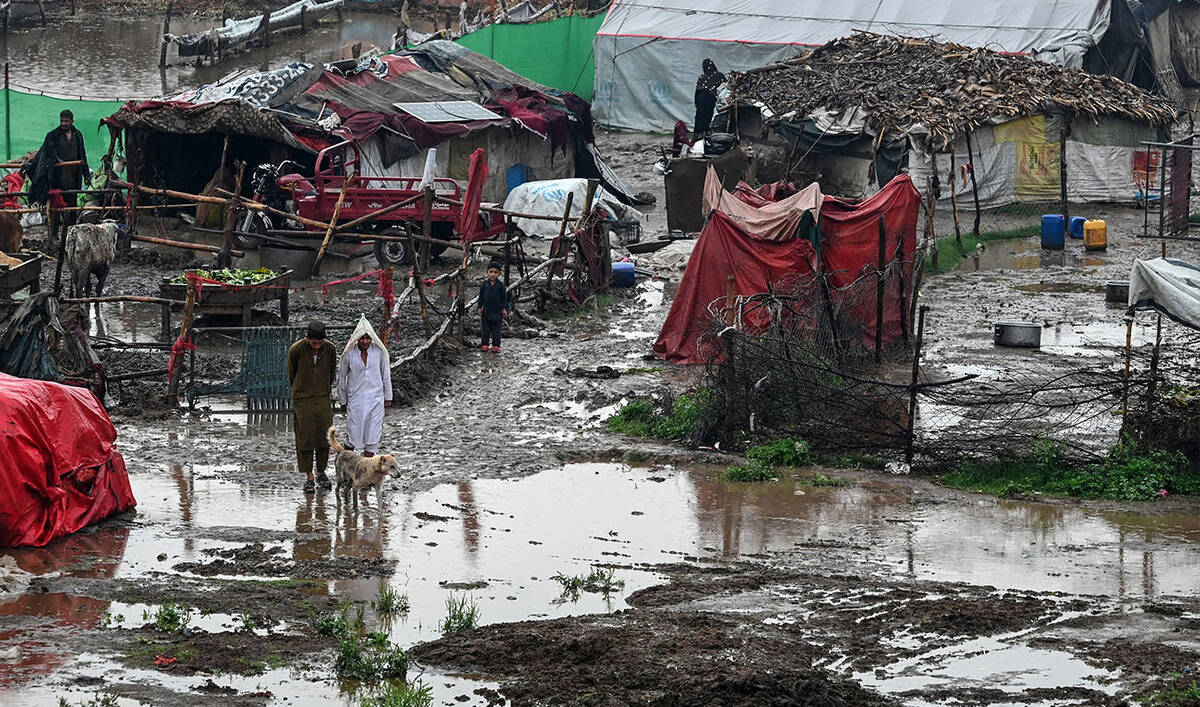 People walk through a pool of water near makeshift shelters after heavy rainfall in Peshawar on April 3, 2026. (AFP)