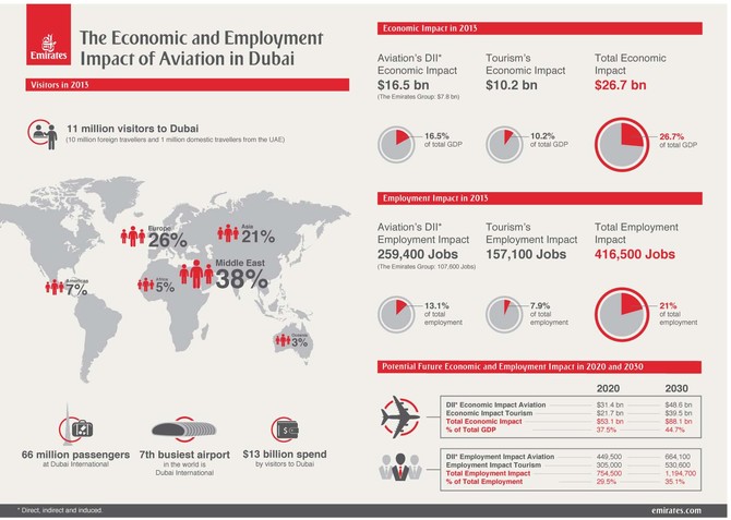 Emirates airline, Dubai Airports and the aviation sector as a whole contributed $26.7 billion to the Dubai economy in 2013, which was almost 27 percent of Dubai’s GDP and supported a total of 416,500 jobs accounting for 21 percent of the emirates’ total employment. The figures were based on the latest report “Quantifying the Economic Impact of Aviation in Dubai” conducted by Oxford Economics, as a follow-up to a 2011 study done by the same firm.